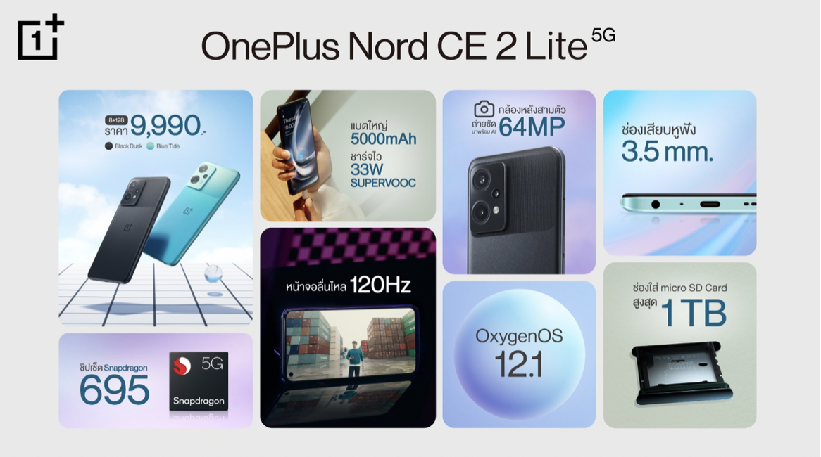 มาพร้อมกับรุ่นน้อง OnePlus Nord CE 2 Lite 5G ในสโลแกน ‘A little more than you’d expect. ให้มากกว่าที่คุณคาดหวัง คุ้มค่าตอบโจทย์ในเครื่องเดียวด้วย Snapdragon 695 ซีพียูแรง แถมประหยัดแบตสุด ๆ จอ 6.59” 120Hz FHD+ เล่นเกมไหลลื่น ไถฟีดโซเชียลมิเดียก็ตอบโจทย์ อีกทั้งแบตเตอรี่ใหญ่ 5,000 mAh ชาร์จไว 33W SuperVOOC พร้อมใช้งานตลอดวัน กล้องคมชัด 64 MP AI Triple Camera และยังเพิ่มพื้นที่จัดเก็บด้วย Micro SD Card ได้ถึง 1 TB พร้อมช่องเสียบหูฟัง 3.5mm