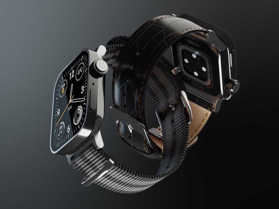 Serge Roux เป็นทั้งวิศวกรเครื่องกล นักออกแบบอุตสาหกรรม และที่ปรึกษานวัตกรรม นำเสนอคอนเซ็ปต์ Apple Watch Pro ที่มาพร้อมตัวเรือนโลหะ ดีไซน์หรูหราด้วยหน้าจอกว้างสุดขอบ มีส่วนขอบด้านข้างที่เรียบแบน โดยออกแบบสายนาฬิกามาให้เลือก 2 แบบ แตกต่างกันที่วัสดุหนังกับไนลอน