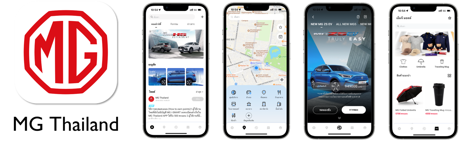 MG Thailand แอพพลิเคชั่นที่เปิดกว้างสำหรับผู้ที่สนใจรถยนต์เอ็มจีสามารถดาวน์โหลดและติดตามความเคลื่อนไหวได้ตลอดเวลา โดยมีฟังก์ชั่นหลักๆ ได้แก่ “ข้อมูลข่าวสารทั่วไป” (FEED) ซึ่งเป็นการรวบรวมข้อมูลข่าวสารความเคลื่อนไหวและกิจกรรมของบริษัทฯ รวมไปถึงยังเป็นช่องทางที่ให้ผู้ใช้งานสามารถแสดงความคิดเห็นและแลกเปลี่ยนประสบการณ์การใช้รถยนต์ สอดรับกับไลฟ์สไตล์ของผู้บริโภคยุคใหม่มากขึ้น ฟังก์ชั่น “ข้อมูลผลิตภัณฑ์” (PRODUCT EXPLORE) ที่รวบรวมข้อมูลรถยนต์เอ็มจีทุกรุ่น สามารถค้นหาโชว์รูม นัดหมายทดลองขับได้ง่ายขึ้น และเตรียมเพิ่มฟังก์ชั่นจองรถในเร็วๆ นี้ สำหรับลูกค้าที่เป็นเจ้าของรถยนต์เอ็มจีที่ต้องใช้งานระบบปฏิบัติการอัจฉริยะ i-SMART ก็สามารถสั่งการ ควบคุม และตรวจสอบสถานะของรถผ่านแอพพลิเคชั่นได้ แบบเรียลไทม์ นอกจากนี้ยังมีฟังก์ชั่นที่ช่วยให้การชาร์จของรถยนต์พลังงานไฟฟ้าสะดวกสบายมากขึ้น รวมถึงบริการหลังการขาย Passion Service ฟังก์ชั่น “แผนที่” (NAVIGATION) สามารถค้นหาสถานที่ สถานีอัดประจุไฟฟ้าของผู้ให้บริการหลักๆ ในประเทศไทย อีกทั้งยังสามารถจองคิวสถานี MG Super Charge ได้ด้วย รวมไปถึง “ข้อมูลส่วนบุคคล” (MY PROFILE) ที่รวบรวมข้อมูล รายการโปรด การตั้งค่าแจ้งเตือนต่างๆ และยังมีฟังก์ชั่น “เอ็มจี มอลล์” (MG MALL) ให้ผู้ใช้งานร่วมกิจกรรมและสะสมแต้มเพื่อแลกซื้อสินค้าหลากหลายรายการ