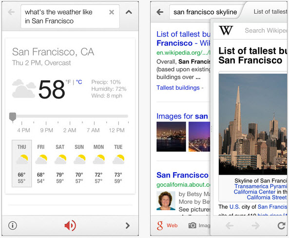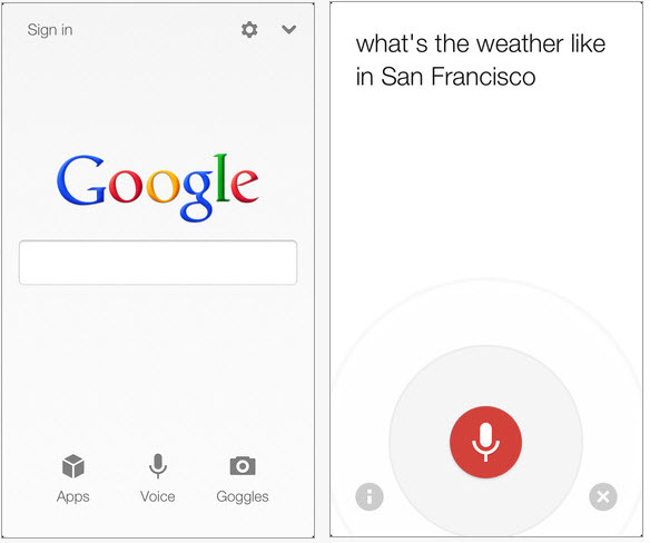 Google Search บน iOS นี้มีความสามารถในการสั่งค้นหาข้อมูลต่างๆบน Google ด้วยเทคโนโลยี voice recognition หรือการสั่งงานด้วยเสียงนั่นเอง ทำให้สามารถเข้าใจประโยคคำถามที่ถามไป ตัวอย่างเช่น “What is the weather like in London?” หรือ “Play me the trailer for the latest Bond movie” เป็นต้น ดังนั้นไม่ว่าจะถามเกี่ยวกับ ข้อมูลเส้นทาง ข้อมูลเที่ยวบิน สภาพอากาศ ตารางกีฬา หรือแม้กระทั่งสั่งให้เปิดเทรลเลอร์ภาพยนตร์ด้วยคำพูดก็สามารถทำได้ นอกจากนี้แอพพลิเคชั่นยังสามารถแสดงผลการค้นหาแบบการพิมพ์ตัวอักษรของ Google ได้อีกด้วย