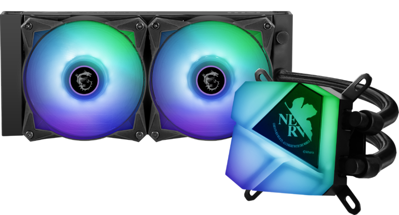 ชุดระบายความร้อนด้วยน้ำแบบออลอินวัน (AIO) MAG CORELIQUID C240 EVA e: PROJECT All-in-One (AIO) เป็นอีกหนึ่งอุปกรณ์ประกอบหลักของซีรีส์นี้ โดยมี EVA-01 TEST TYPE เป็นดีไซน์หลัก บล็อกน้ำของชุดระบายความร้อนประกอบด้วยแสง ARGB ที่สวยงาม พร้อมด้วยไฮไลท์สีม่วงที่ช่วยดึงคาแร็กเตอร์ของ EVA-01 TEST TYPE ออกมา ยิ่งไปกว่านั้น บล็อกน้ำยังโดดเด่นสะดุดตาด้วย โลโก้ NERV