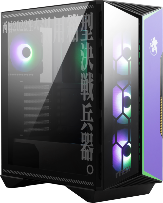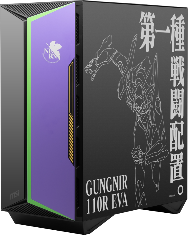 คุณจะได้พบกับเคส MPG GUNGNIR 110R EVA e-PROJECT ชุดสีม่วงและเขียวช่วยเสริมดีไซน์ที่โฉบเฉี่ยว สะท้อนเอกลักษณ์ของ EVA-01 TEST TYPE แผงด้านข้างเป็น tempered glass และโดดเด่นด้วยฟอนต์ที่คุ้นเคยของ Evangelion ในขณะที่แผงด้านข้างอีกด้านของเคสจะเผยให้เห็นถึงความเป็น EVA-01 TEST TYPE