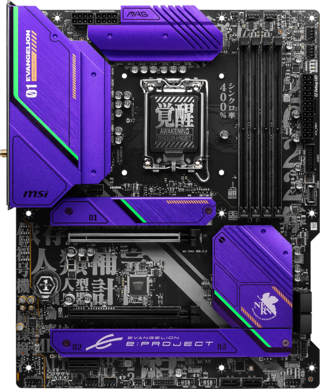 เมนบอร์ดรุ่นลิมิเต็ดเอดิชั่น MAG B660 TOMAHAWK EVA e: PROJECT ดึงดูดทุกสายตาด้วยดีไซน์และโทนสีในแบบ EVA-01 TEST TYPE ไม่เหมือนใคร ด้วยแผงระบายความร้อนขนาดใหญ่มาพร้อมข้อความ EVA-01 TEST TYPE ที่ทอดตัวไปกับแผงระบายความร้อนของชิปเซ็ตและโชว์ให้เห็นโลโก้ ‘NERV’ ที่ใครๆ ก็รู้จัก มาพร้อมกับฟอนต์ของ EVANGELION ที่จะสร้างภาพลักษณ์ที่โดดเด่นให้กับทั้งเมนบอร์ด นอกจากนี้ Mystic Light ของ MSI ยังมอบเอฟเฟกต์แสง EVA แบบเอกสิทธิ์เฉพาะตัวเพื่อให้ดูมีระดับมากขึ้นไปอีก คุณจะสามารถเชื่อมโยง RGB ทุกเฉดสีเพื่ออวดสีสันที่สวยงามของ EVANGELION ได้ด้วยการคลิกเพียงครั้งเดียว พร้อมพื้นหลังที่ดีไซน์มาเป็นพิเศษของ MSI Center ในโหมดมืด/สว่าง