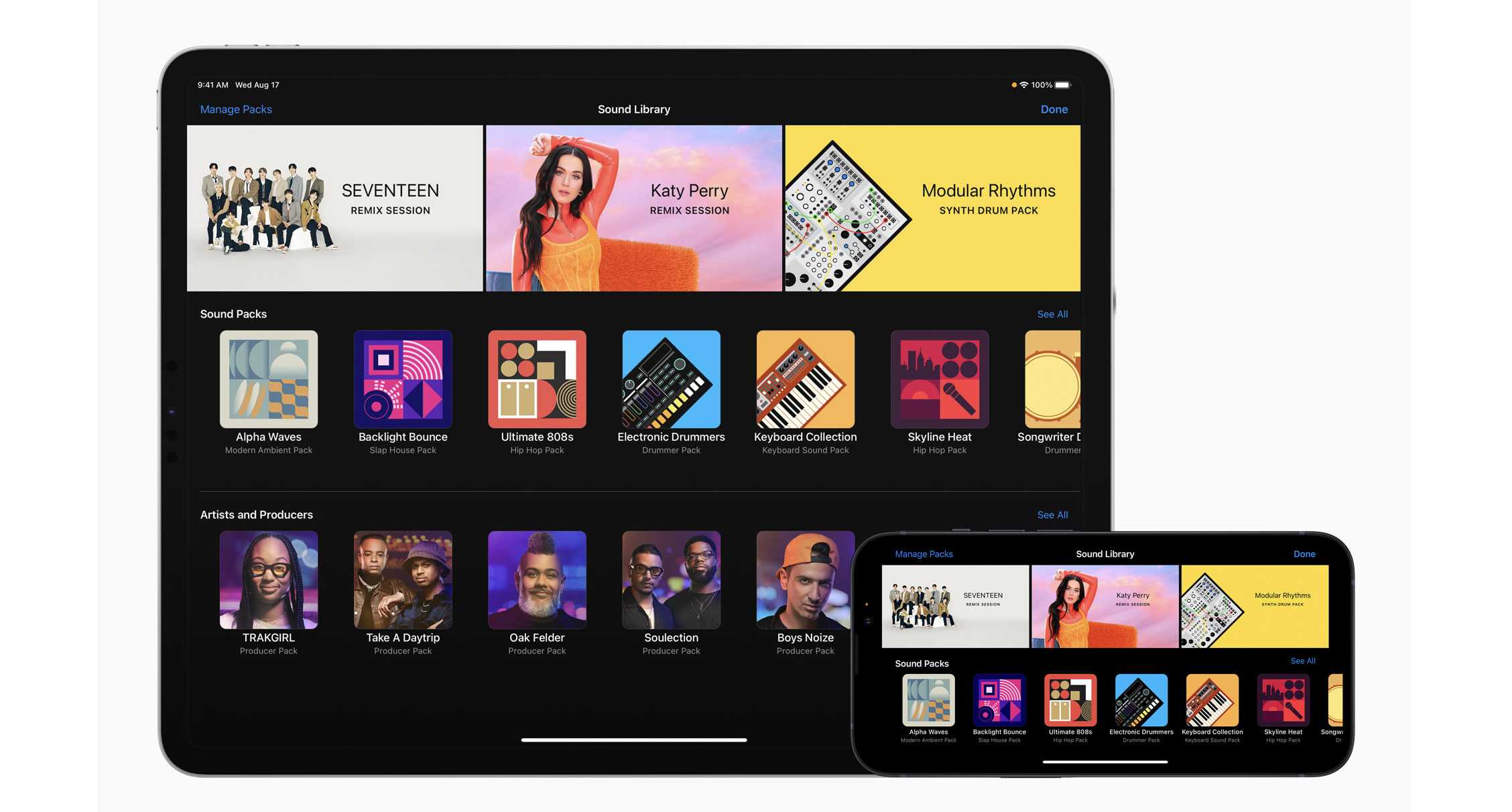 ตั้งแต่วันนี้เป็นต้นไป GarageBand สำหรับ iOS และ iPadOS จะมาพร้อมกับเซสชั่นรีมิกซ์เพลงในแอป ซึ่งมีเพลงจาก Katy Perry และวงเคป็อปซูเปอร์กรุป SEVENTEEN เซสชั่นรีมิกซ์ของ GarageBand ช่วยให้ทุกคนสามารถปลอดปล่อยอินเนอร์ดีเจโดยใช้แทร็คเพลงจากศิลปินชั้นนำในปัจจุบัน และเมื่อได้รับแรงบันดาลใจในแอปจากศิลปินเองและวิดีโอแนะนำทีละขั้นตอน เซสชั่นจะช่วยให้นักดนตรีไฟแรงสามารถใส่ความเป็นตัวเองลงไปในเพลงฮิตอย่าง “Harleys in Hawaii” โดย Katy Perry และ “Darl+ing” โดย SEVENTEEN