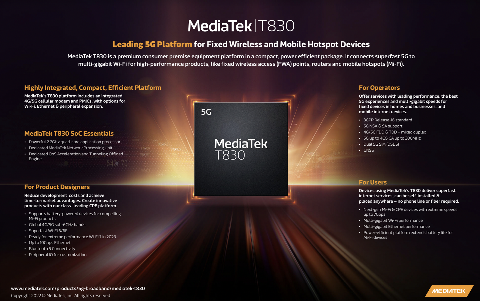 สำหรับผู้ผลิตอุปกรณ์แล้ว แพลตฟอร์ม T830 ได้รับการออกแบบให้มีขนาดกะทัดรัดและมีการผสานรวมขั้นสูง ช่วยให้ประหยัดพลังงานได้มาก และลดเวลาและต้นทุนในการพัฒนาอีกด้วย ผู้ให้บริการจึงสามารถให้บริการความเร็ว 5G สูงสุดที่ 7Gbps ได้ทันทีโดยใช้โครงสร้างพื้นฐานเซลลูลาร์ Sub-6GHz โดยไม่ต้องเสียค่าใช้จ่ายติดตั้งเทคโนโลยีใช้สายเพิ่มเติม เช่น สายเคเบิลหรือไฟเบอร์ นอกจากนี้ ผู้บริโภคยังจะได้เพลิดเพลินไปกับบริการอินเทอร์เน็ตความเร็วสูงจากอุปกรณ์ขนาดเล็กที่สามารถติดตั้งเองได้ โดยไม่ต้องวุ่นวายกับการติดตั้งบรอดแบนด์โทรศัพท์พื้นฐานที่ใช้เวลานาน