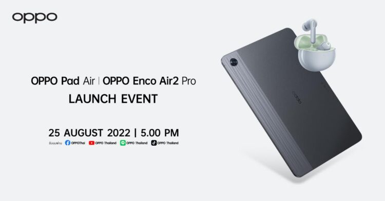 เตรียมพบกับผลิตภัณฑ์ IoT สุดล้ำจากออปโป้ทั้ง “OPPO Pad Air” และ “OPPO Enco Air2 Pro” รับชมไลฟ์พร้อมกันในวันที่ 25 สิงหาคม 2565 นี้ ในวันพฤหัสบดีที่ 25 สิงหาคม เวลา 17:00 น. เป็นต้นไป ได้ทาง Facebook, YouTube, Line Official และ TikTok ของ OPPO Thailand เท่านั้น