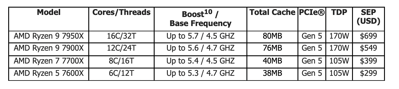 โปรเซสเซอร์ AMD Ryzen 7000 Series คาดว่าจะพร้อมวางจำหน่ายผ่านร้านค้าตัวแทนจำหน่ายชั้นนำทั่วโลก ตั้งแต่วันอังคารที่ 27 กันยายน ศกนี้ ในราคาเริ่มต้น 299 เหรียญสหรัฐ