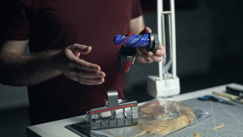 การออกแบบแถบแปรงใหม่นี้ได้รับแรงบันดาลใจมาจากเทคโนโลยีการใช้หวีช่วยลดผมพันกัน (De-tangling Comb) ของ Dyson โดยแถบแปรงประกอบด้วยซี่กำจัดเส้นขน 56 ซี่ที่วางองศามาเพื่อปัดเส้นขนในทุกรูปแบบไปสู่ท่อดูดฝุ่นโดยตรง องค์ประกอบอันสมบูรณ์ที่ประกอบด้วยซี่โพลีคาร์บอเนต ขนแปรงไนลอนทรงเกลียว เส้นใยคาร์บอนไฟเบอร์ที่ลดไฟฟ้าสถิต และพลังดูดที่ทรงพลัง ทำให้สามารถดูดทำความสะอาดได้ตั้งแต่ฝุ่นขนาดเล็กจนไปถึงเศษขนาดใหญ่ พร้อมยังแก้ปัญหาการม้วนพันของเส้นขนได้อย่างมีประสิทธิภาพ