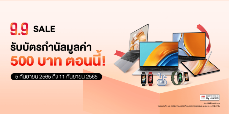 หัวเว่ย คอนซูมเมอร์ บิสสิเนส กรุ๊ป (ประเทศไทย) เคาะดีลเด็ดเพื่อลูกค้าชาวไทยโดยเฉพาะกับโปรโมชัน HUAWEI 9.9 Sales ลดราคาสินค้าไอทีสูงสุดถึง 50% พร้อมให้เลือกหยิบสินค้าลงตะกร้าในราคาสุดพิเศษ แล้วกด Check out ด้วยรอยยิ้มของผู้ชนะในสัปดาห์แห่งการช็อปปิงของเดือนกันยายนนี้! มาครบทั้งแล็ปท็อป แท็บเล็ต สมาร์ทวอทช์ สมาร์ทแบนด์ และหูฟังไร้สาย ตั้งแต่วันที่ 5 กันยายน 2565 ถึง 11 กันยายน 2565 ที่เว็บไซต์ HUAWEI Store รวมถึงที่ร้านค้าอย่างเป็นทางการของหัวเว่ยบน Shopee และ Lazada พร้อมรับส่วนลดออนท็อปและของสมนาคุณอีกมากมายสำหรับผู้ใช้แอปพลิเคชัน My HUAWEI