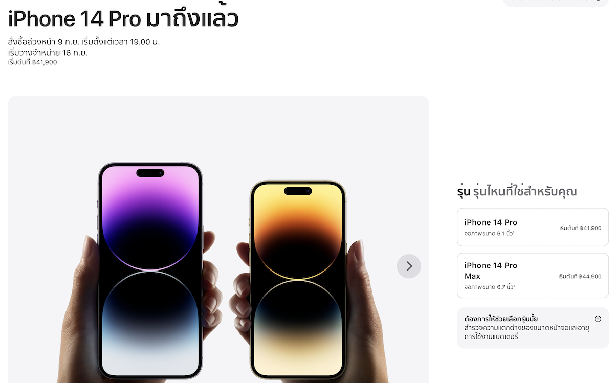 - ลูกค้าสามารถซื้อ iPhone 14 Pro ในราคา 41,900 บาท และ iPhone 14 Pro Max ในราคา 44,900 บาท ที่ apple.com/th/store, ในแอป Apple Store และที่ร้าน Apple Store iPhone 14 และ iPhone 14 Pro Max ยังวางจำหน่ายผ่านตัวแทนจำหน่ายที่ได้รับอนุญาตของ Apple และผู้ให้บริการเครือข่ายโทรศัพท์อีกหลายรายด้วย12