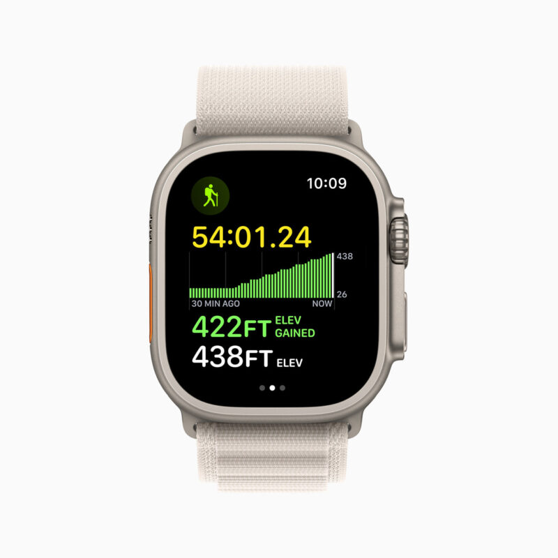 Apple Watch Ultra มีจอภาพที่ใหญ่ขึ้นและสว่างขึ้นในดีไซน์ที่สมบุกสมบัน จึงเป็นเครื่องมือทางเทคนิคที่ตอบโจทย์ของนักผจญภัยและนักสำรวจในหลากหลายสภาพแวดล้อม ตั้งแต่ปกติทั่วไปจนถึงขั้นเอ็กซ์ตรีม และยังมีแอปเข็มทิศที่ออกแบบมาใหม่หมดใน watchOS 9 ที่จะดึงข้อมูลขึ้นมาแสดงมากขึ้นใน 3 มุมมองที่แตกต่างกัน แอปสามารถแสดงมุมมองแบบผสมที่แสดงทั้งหน้าปัดเข็มทิศแบบอนาล็อกพร้อมๆ กับมุมมองแบบดิจิทัลได้ เมื่อหมุน Digital Crown ผู้ใช้จะเห็นมุมมองอื่นๆ เพิ่มเติมที่แสดงละติจูด ลองจิจูด ระดับความสูง และความชัน รวมทั้งมุมมองสำหรับการใช้เข็มทิศนำทางที่แสดงจุดอ้างอิงเข็มทิศและการติดตามการเดิน