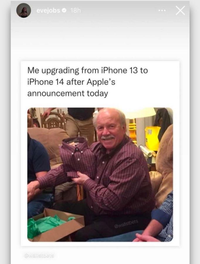 มีมดังกล่าวเป็นรูปภาพคุณปู่ที่ได้รับของขวัญเป็นเสื้อเชิ้ตลายเดียวกับที่เขาสวมใส่อยู่ ซึ่ง Eve Jobs ได้แชร์ภาพนี้ลง Instagram พร้อมข้อความว่า “ฉันอัปเกรดจาก iPhone 13 เป็น iPhone 14 หลังจาก Apple เปิดตัวในวันนี้”