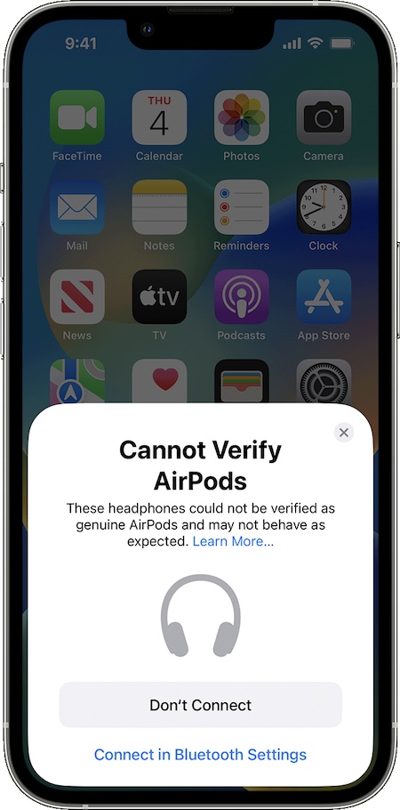 ในหน้าต่างแจ้งเตือน Cannot Verify AirPods ยังมีปุ่ม Don’t Connect เพื่อยกเลิกการเชื่อมต่อ แต่ก็ยังมีข้อความ Connect in Bluetooth Settings ที่ส่งไปยังการตั้งค่า Bluetooth เพื่อเชื่อมต่อด้วยตัวเอง