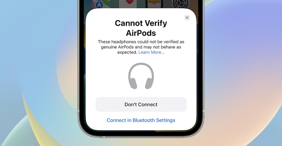 คู่มือของ Apple อธิบายสั้นๆ ว่า ถ้ามีการนำ AirPods ของปลอม มาเชื่อมต่อกับ iPhone, iPad หรือ iPod touch จะได้รับการแจ้งเตือนว่า ‘Cannot Verify AirPods’ พร้อมบอกว่า หากมีการเชื่อมต่อกับ AirPods ที่ไม่ใช่ของแท้ หูฟังอาจไม่ทำงานตามที่คาดไว้