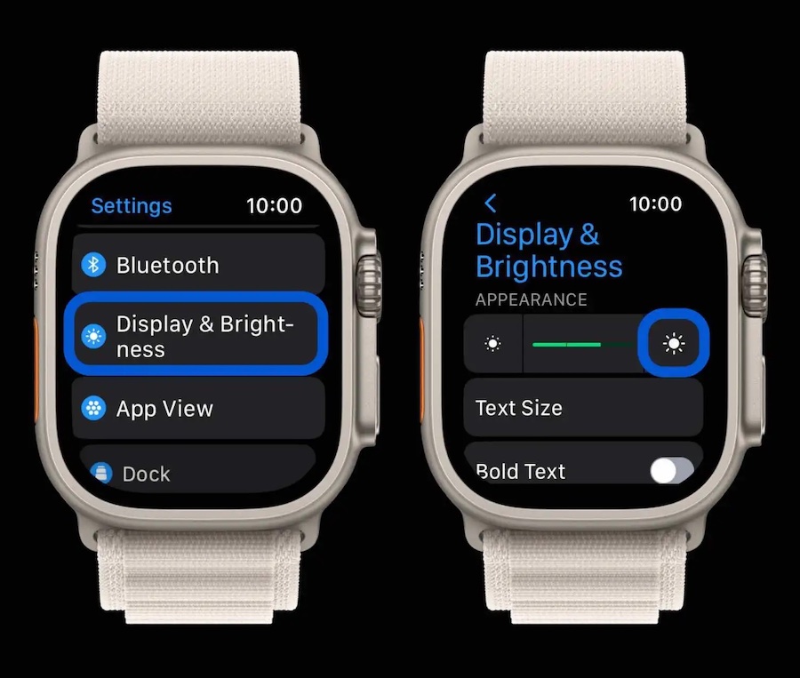 Apple Watch Ultra มาพร้อมจอภาพ Retina ที่ให้ความสว่างสูงสุดถึง 2,000 นิต ขณะที่ Apple Watch Series 8 และ Apple Watch SE รุ่นที่ 2 ให้ความสว่างสูงสุด 1,000 นิต แต่จอแสดงผลของ Apple Watch จะปรับระดับความสว่างโดยอัตโนมัติ นอกจากว่าจะเข้าไปตั้งค่าด้วยตัวเอง