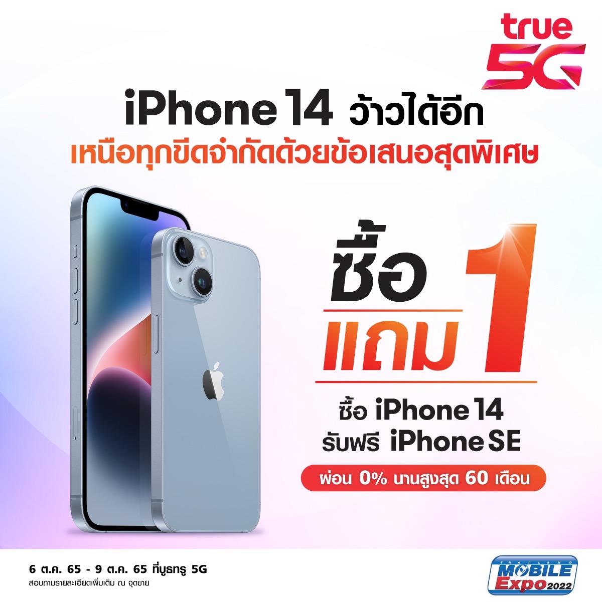ส่วนทางทรู 5G ได้เตรียมพบกับโปรโมชั่นพิเศษไฮไลท์เด็ด iPhone 14 ซื้อ 1 แถม 1 และรับส่วนลดสูงสุดถึง 90% ที่งาน Thailand Mobile Expo 2022 เฉพาะที่บูธทรู 5G เท่านั้น