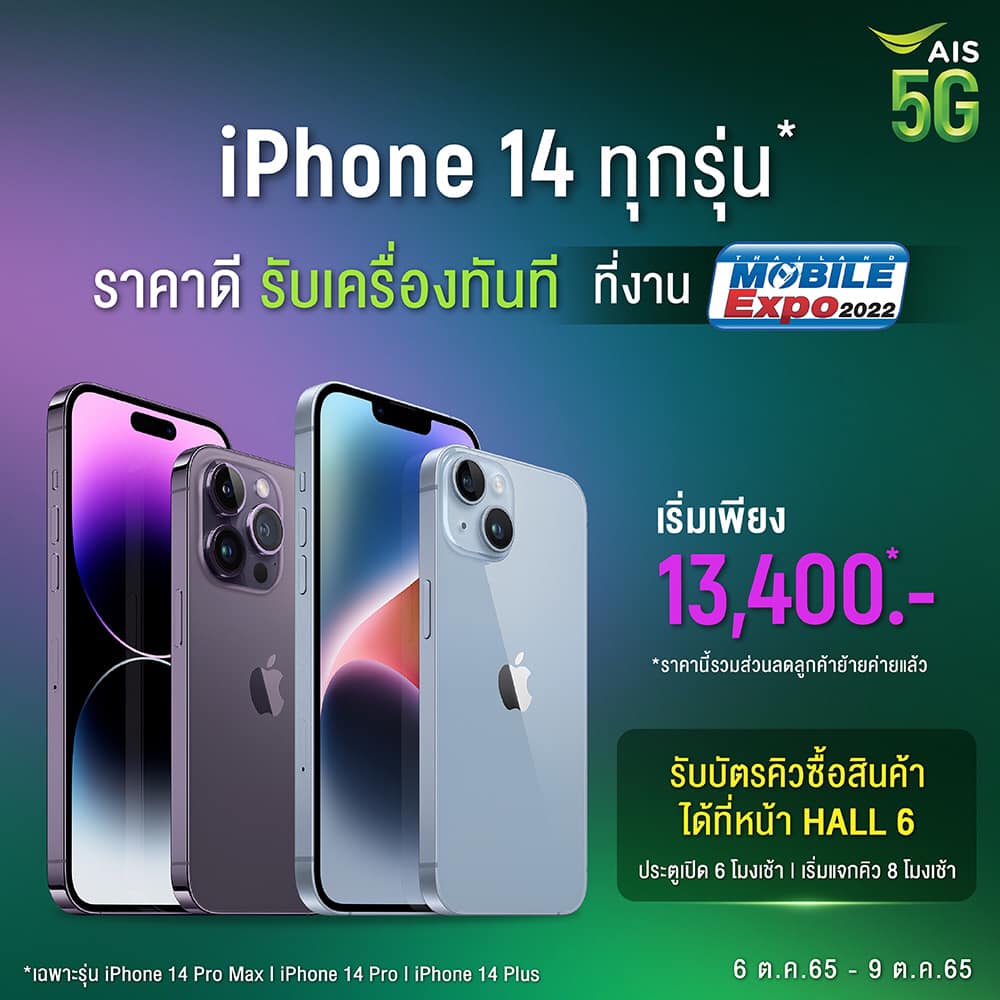 ใครที่ตามหาและอยากเป็นเจ้าของ iPhone 14 กันอยู่แล้วละก็ ต้องรีบเข้ามาที่งาน Thailand Mobile Expo กันแล้ว เพราะทาง AIS ได้จัดให้เป็นเจ้าของ iPhone 14 Pro Max , iPhone 14 Pro และ iPhone 14 Plus ทุกสี ทุกขนาดความจุ ได้ในงาน Thailand Mobile Expo 2022 โดยสามารถเข้ามาเพื่อเช็กสิทธิ์ และรับบัตรคิวซื้อได้ที่หน้าฮอลล์ 6 ตั้งแต่เวลา 06.00 น.เป็นต้นไปและเริ่มจ่ายบัตรคิวตั้งแต่เวลา 08.00 น. ระหว่างวันที่ 6 ต.ค.65 – 9 ต.ค.65 และสามารถนำบัตรคิวไปรับสิทธิ์ได้ที่บูธ AIS (PL5) ฮอลล์ 6