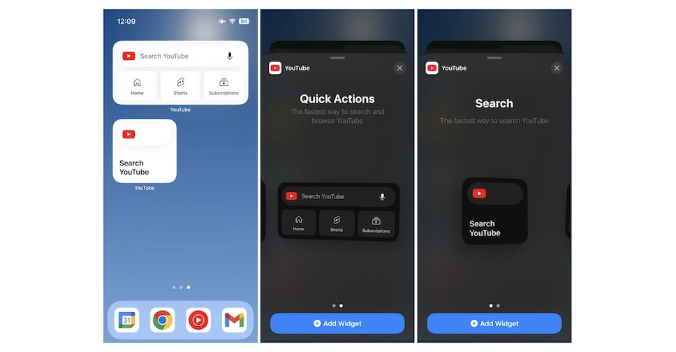 นอกจากนี้ยังมีวิดเจ็ต Search ขนาด 2 x 2 ที่มีพื้นหลังสีดำหรือสีขาว ขึ้นอยู่กับธีมของระบบ ช่วยให้ผู้ใช้งานค้นหาวิดีโอที่ต้องการได้อย่างรวดเร็ว