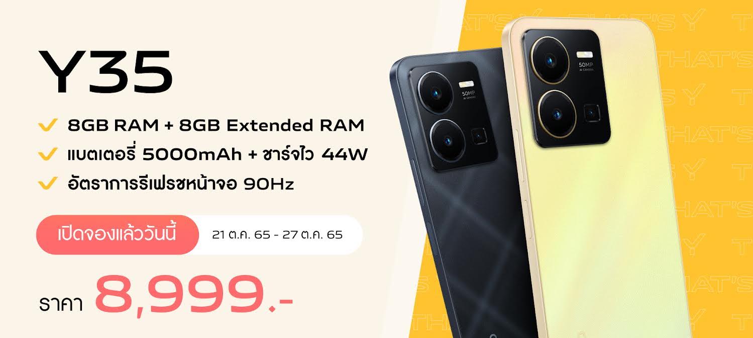 vivo แบรนด์สมาร์ตโฟนชั้นนำระดับโลก เปิดโอกาสให้แฟนๆ ได้จับจองเป็นเจ้าของ vivo Y35 สมาร์ตโฟนรุ่นใหม่ตระกูล Y series ก่อนใคร! มาพร้อมสเปกใหม่แบบจัดเต็ม สัมผัสประสบการณ์การใช้งานอย่างไหลลื่น มาพร้อมหน้าจอแสดงผล FHD+ ขนาด 6.58 นิ้ว รีเฟรชเรท 90Hzให้มุมมองที่กว้าง สมจริง สำหรับทั้งวิดีโอและเกม รองรับหน่วยความจำ RAM 8GB เสริมทัพด้วย Extended RAM อีก 8GB รวมถึงแบตเตอรี่ความจุ 5,000 mAh รองรับเทคโนโลยีชาร์จไว 44W ช่วยให้การใช้งานสมาร์ตโฟนของคุณลื่นไหลไม่มีสะดุด