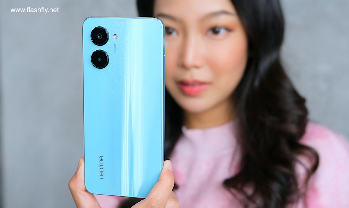 realme C33 ที่เปิดตัวในไทย มีให้เลือก 2 สี ได้แก่ Aqua Blue ซึ่งเป็นตัวเลือกที่ทีมงาน @Flashfly ได้รับมารีวิว มาในโทนสีฟ้าน้ำทะเล ซึ่งได้แรงบันดาลใจมาจากช่วงวันหยุดที่ด้เดินทางไปพักผ่อนริมทะเล มาพร้อมเอฟเฟกค์สะท้อนแสงที่ให้ความโรแมนติก ส่วนอีกตัวเลือกมาในโทนสีดำ Night Sea ที่สวยงามไม่แพ้กัน และเข้ากับทุกสไตล์ในชีวิตประจำวัน