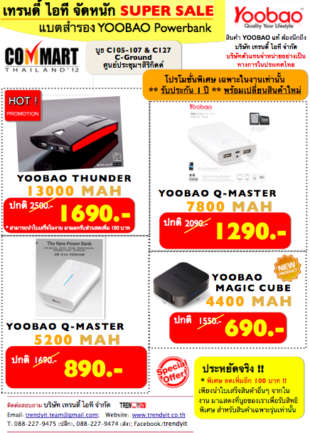 โปรโมชั่น แบตสำรองสุดฮิต YOOBAO POWERBANK ที่งาน Commart 2012 สามารถพบกับสินค้าจากทางเราได้ที่ บูธ C105-107, C127 สินค้าที่นำมามีทั้ง