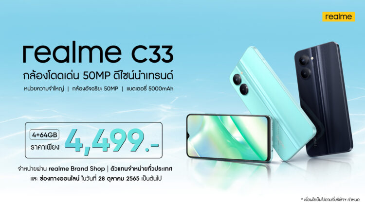 realme (เรียลมี) แบรนด์เทคโนโลยีเพื่อคนรุ่นใหม่ที่เติบโตเร็วที่สุดในโลก จัดงานฉลอง First Sale สมาร์ตโฟนรุ่นใหม่ล่าสุดในตระกูล C Series “realme C33” ที่สร้างกระแสฮือฮาจากสุดยอดงานดีไซน์ที่หรูหรางดงามดังระลอกคลื่นน้ำแห่งท้องทะเล บวกกับขุมพลังกล้องล้ำนำเทรนด์กว่า 50 ล้านพิกเซล โดย “realme C33” นำเสนอรุ่นความจุ 4/64GB ในราคาเริ่มต้น 4,499 บาท เริ่มวางจำหน่ายตั้งแต่วันที่ 28 ตุลาคมนี้ ที่ realme Brand Shop ทุกสาขาและร้านค้าดีลเลอร์ของแบรนด์ รวมถึงร้านค้าออนไลน์ชื่อดังทั้ง Shopee, Lazada และ JD Central โดยมาพร้อมแก็ดเจ็ตสุดล้ำที่จะเติมเต็มไลฟ์สไตล์ยุคดิจิทัลให้สมบูรณ์แบบกับ “realme Buds T100” หูฟังบลูทูธกับดีไซน์สุดคูลด้วยโทนสีแบบ Two Tone พิเศษ! สุดคุ้มกับราคาโปรโมชั่นฉลองการเปิดตัวเพียง 499 บาท จาก 699 บาท ตั้งแต่ 28 ตุลาคม – 3 พฤศจิกายนนี้ วางจำหน่ายเฉพาะช่องทางออนไลน์ที่ Shopee เท่านั้น