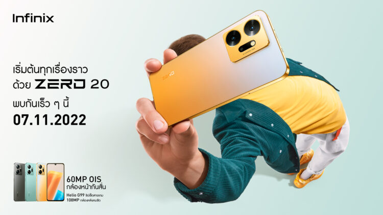Infinix ZERO 20 มาพร้อมดีไซน์สวยล้ำทันสมัย พกพาสะดวก จับถนัดมือ เน้นจับกลุ่มคนรุ่นใหม่ที่มีไลฟ์สไตล์ ชื่นชอบการถ่ายภาพ สำหรับรุ่นนี้จะเป็นสมาร์ตโฟนรุ่นแรกของโลกที่โดดเด่นด้วยกล้องหน้าที่มีระบบกันสั่นแบบ OIS ความละเอียด 60 ล้านพิกเซล พร้อมกล้องหลังความละเอียด 108 ล้านพิกเซล ซึ่งการันตีว่าสามารถจับทุกรายละเอียดของภาพในทุกมุมมองได้แบบมือโปร และเสริมประสิทธิภาพการใช้งานที่ยอดเยี่ยม ลื่นไหลด้วยชิปเซ็ต MediaTek Helio G99 พร้อมจัดเต็มด้วยหน่วยพื้นที่ความจำ 256 GB กับแรม 8+5GB โดยรุ่นนี้ได้มีการร่วมมือกับทาง Discovery เพื่อสร้างแรงบันดาลใจให้กับหนุ่มสาวรุ่นใหม่ให้ได้ออกเดินทางไปสำรวจโลก และแชร์การค้นพบใหม่ๆ ผ่านเลนส์กล้องของ Infinix ZERO 20 อีกทั้งยังจัดกิจกรรมและมอบของรางวัลสุดเอ็กซ์คลูซีฟผ่านทางเฟซบุ๊ก Infinix Thailand