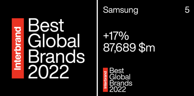 ซัมซุง อิเลคโทรนิคส์ ได้รับการรับรองจากอินเตอร์แบรนด์ ที่ปรึกษาด้านแบรนด์ระดับโลก ให้เป็น 1 ใน 5 บริษัทที่ดีที่สุดตามการจัดอันดับ Best Global Brands 2022 ในแต่ละปีอินเตอร์แบรนด์จะจัดอันดับแบรนด์ต่างๆ ที่มีมูลค่าสูงที่สุด 100 อันดับ และมูลค่าของแบรนด์ซัมซุงอยู่ที่ 87.7 พันล้านเหรียญสหรัฐ ตามการประเมินของอินเตอร์แบรนด์ สูงกว่าเมื่อปี 2021 ที่ 74.6 พันล้านเหรียญที่ร้อยละ 17 ส่งผลให้ซัมซุงอยู่ในอันดับที่ 5 ของการจัดอันดับโดยอินเตอร์แบรนด์เป็นเวลา 3 ปีติดต่อกัน