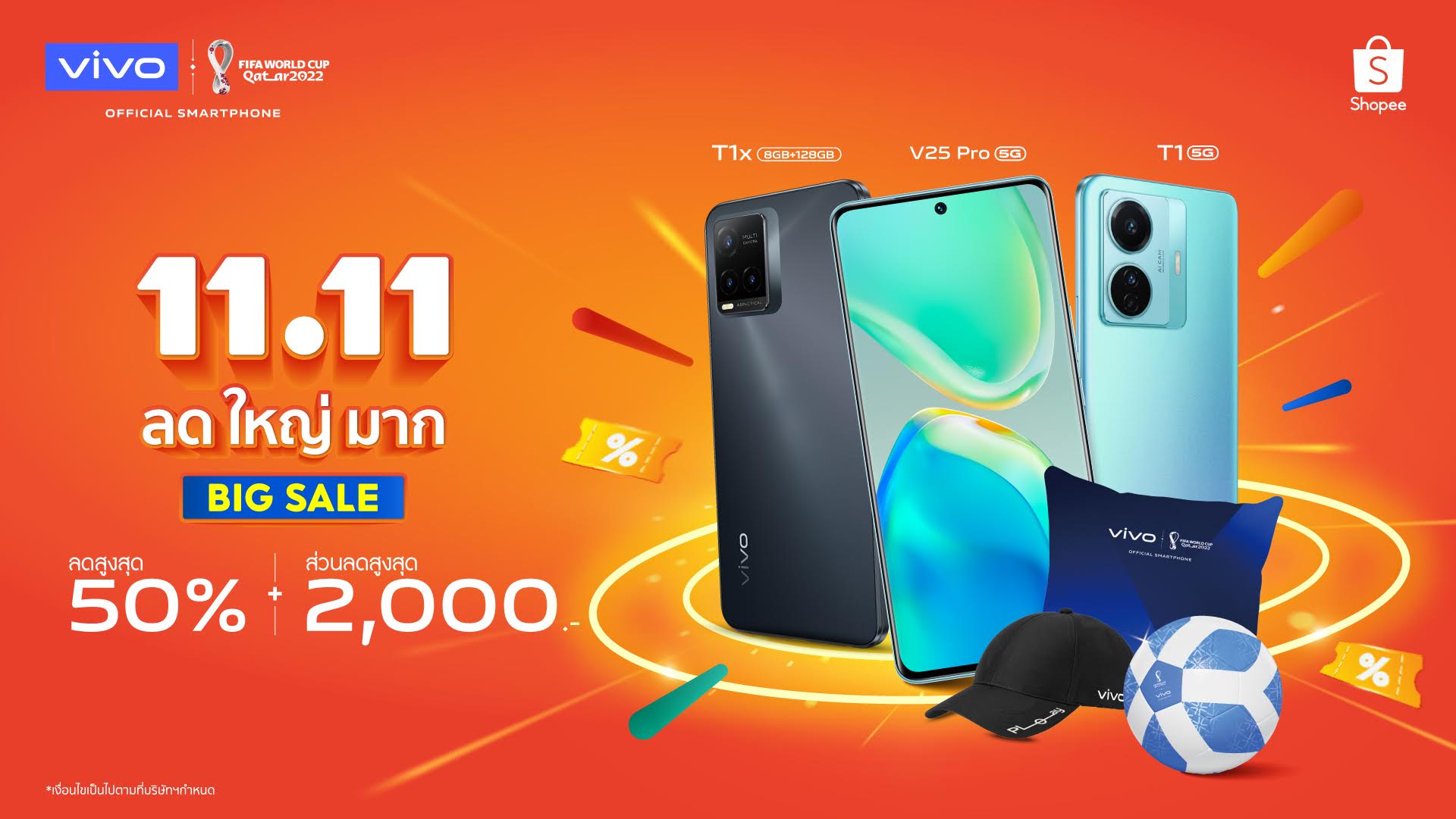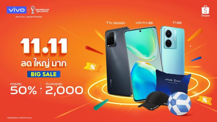 vivo แบรนด์สมาร์ทโฟนชั้นนำระดับโลกผู้สนับสนุนอย่างเป็นทางการของการแข่งขันฟีฟ่า เวิลด์คัพ กาตาร์ 2022 (FIFA World Cup Qatar 2022™) เข้าร่วมแคมเปญ Shopee 11.11 ลด ใหญ่ มาก กับ ช้อปปี้ (Shopee) ผู้นำแพลตฟอร์มอีคอมเมิร์ซในภูมิภาคเอเชียตะวันออกเฉียงใต้และไต้หวัน ยกขบวนสินค้าพร้อมส่วนลดสูงสุด 50% และสิทธิพิเศษอีกมากมาย วันนี้ 11 พฤศจิกายน 2565 เท่านั้น