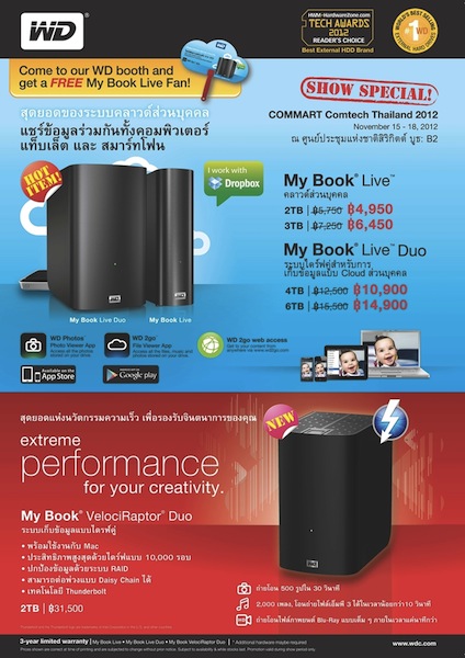 WD® บริษัทในเครือของเวสเทิร์น ดิจิตอล คอร์เปอเรชั่น (WDC) ยักษ์ใหญ่ตลาดฮาร์ดไดรฟ์ อัดฉีดโปรโมชั่นเอาใจคอเอ็กซ์เทอร์นัล ฮาร์ดไดรฟ์ เสนอราคาพิเศษสุดๆ เฉพาะในงานคอมมาร์ต คอมเทค ไทยแลนด์ 2012 จัดขึ้นระหว่างวันที่ 15 – 18 พฤศจิกายน 2555 เวลา 10.00 – 20.00 น. ณ ศูนย์ประชุมแห่งชาติสิริกิติ์ เชิญแวะชมสินค้าพร้อมสอบถามรายละเอียดโปรโมชั่นได้ที่บูธ WD หมายเลข B2 ชั้นสอง ณ ศูนย์การประชุมแห่งชาติสิริกิติ์
