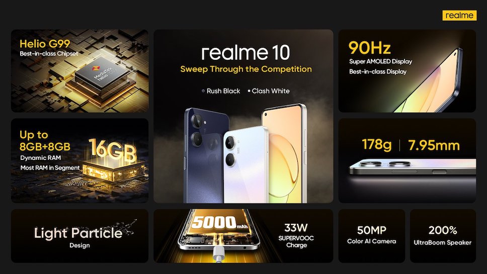 realme 10 มีให้เลือกอย่างน้อย 2 สี ได้แก่ Rush Black และ Clash White ดีไซน์บาง 7.95 มิลลิเมตร น้ำหนัก 178 กรัม โดยมีราคาแตกต่างกันดังนี้