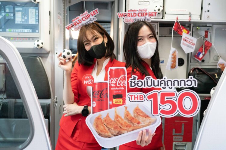แอร์เอเชียร่วมกับโคคา โคล่า ต้อนรับเทศกาลการแข่งขันฟุตบอลโลก จัดกิจกรรมพิเศษบนเที่ยวบิน* พร้อมจัดโปรโมชันชุดอิ่มคุ้ม World Cup Set ในราคา 150 บาท เอาใจแฟนบอล เพียงซื้อเกี๊ยวซ่า โอซาก้า โอโช คู่กับโค้กสูตรออริจินัลหรือโค้กสูตรไม่มีน้ำตาล รับทันทีโค้กสูตรไม่มีน้ำตาลเพิ่มอีก 1 กระป๋อง ฟรี!** เริ่มสั่งชุดอิ่มคุ้มบนเที่ยวบินได้แล้ววันนี้ จนถึง 31 ธันวาคม 2565