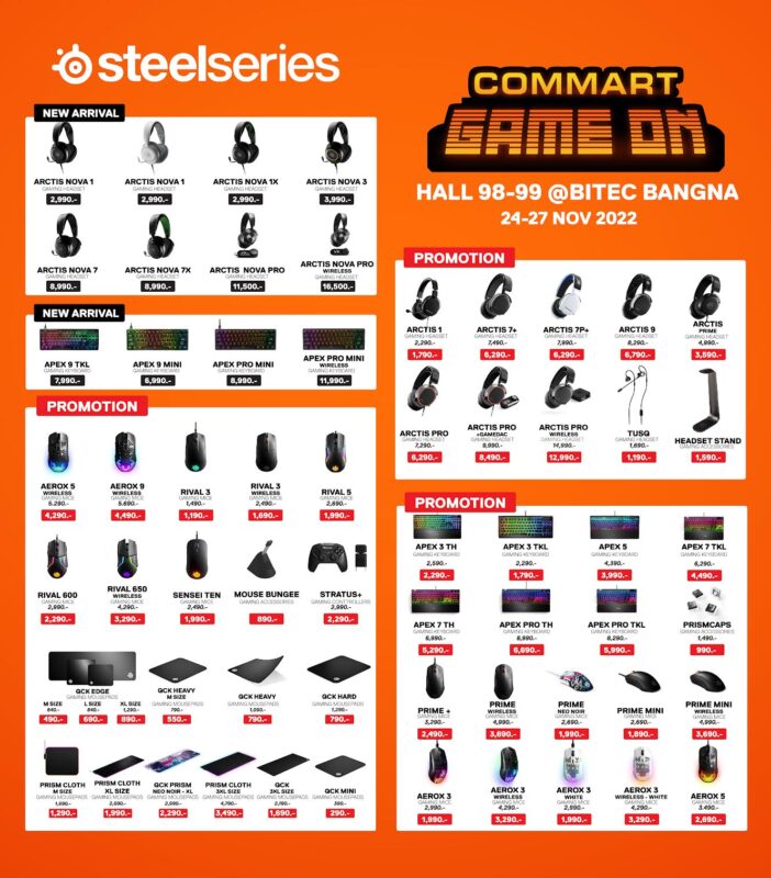 โดยภายในงาน COMMART Game On ท่านจะได้พบกับอุปกรณ์เกมมิ่งที่เป็นไฮไลท์จากแบรนด์ SteelSeries ที่อาร์ทีบีฯนำมาจำหน่ายที่งาน Commart ที่แรก อาทิ หูฟังไร้สายรุ่นใหม่ Arctis Nova7 และหูฟังมาตอบโจทย์ผู้เล่นเกม X Box รุ่น Arctis Nova 7x และหูฟังรุ่น Arctis Nova ซึ่งเป็นการเปิดตัววันแรกที่งานอีกด้วย นอกจากนี้ยังมาพร้อม เมาส์, คีย์บอร์ด แผ่นรองเมาส์ ฯลฯ ที่ยกขบวนมา จำหน่ายให้เหล่าเกมเมอร์ ราคาพิเศษพร้อมรับส่วนลดสูงสุด 39% ซื้อครบตามเงื่อนไข มีของแถมภายในงานกันอย่างเต็มที่