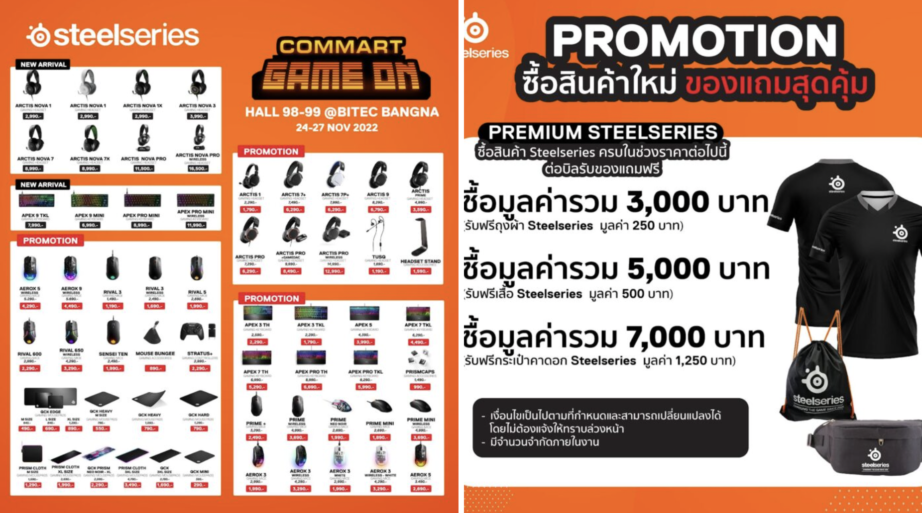 บริษัท อาร์ทีบี เทคโนโลยี จำกัด ผู้นำเข้าและจัดจำหน่ายสินค้า Gadget รายใหญ่ในประเทศไทย และตัวแทนจำหน่าย SteelSeries ในประเทศไทย จับมือ SteelSeries ฉลองส่งท้ายปีด้วยโปรโมชั่นสุดพิเศษ พร้อมรับของสมนาคุณสุดพิเศษที่จัดมาเพื่อเอาใจคอเกมโดยเฉพาะ นอกจากนี้ยังมอบส่วนลดสูงสุด 39% ภายในงาน COMMART Game On ตั้งแต่วันที่ 24 – 27 พฤศจิกายน 2565 โดยพบกันได้ที่ 7 บูธ ได้แก่ JIB , บูธใหญ่ Steelseries x IT City ,บูธใหญ่ Steelseries x Speed Gaming ,Banana IT, Advice , IT City, และ Ace Gamerณ ศูนย์การประชุมไบเทค บางนา ฮอลล์ EH 98-99 เวลา 10:00-20:00 น.