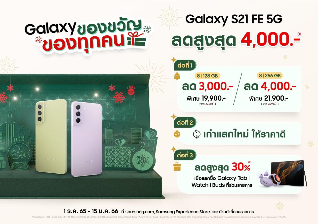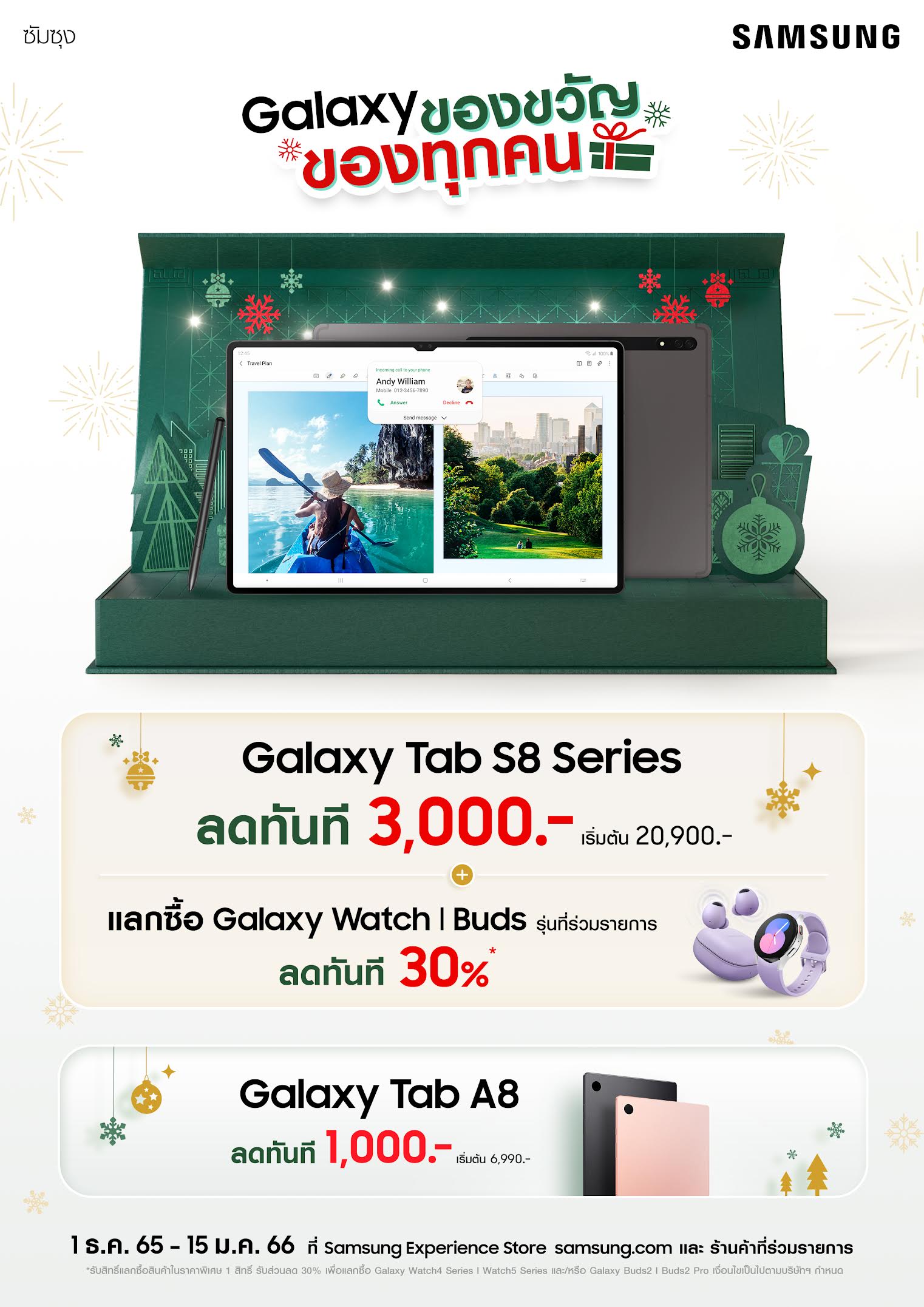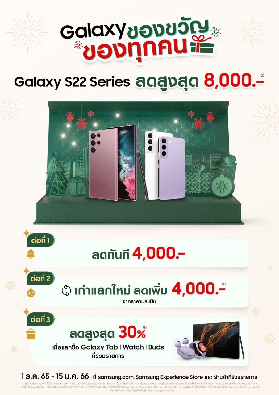 แคมเปญ “Galaxy ของขวัญของทุกคน” เริ่มแล้ววันนี้ถึง 15 ม.ค. 2566 (ยกเว้นเงื่อนไขของรุ่น A Series ลดถึงวันที่ 8 ม.ค 2566 เท่านั้น) ที่ samsung.com, Samsung Experience Store และร้านค่าที่ร่วมรายการ