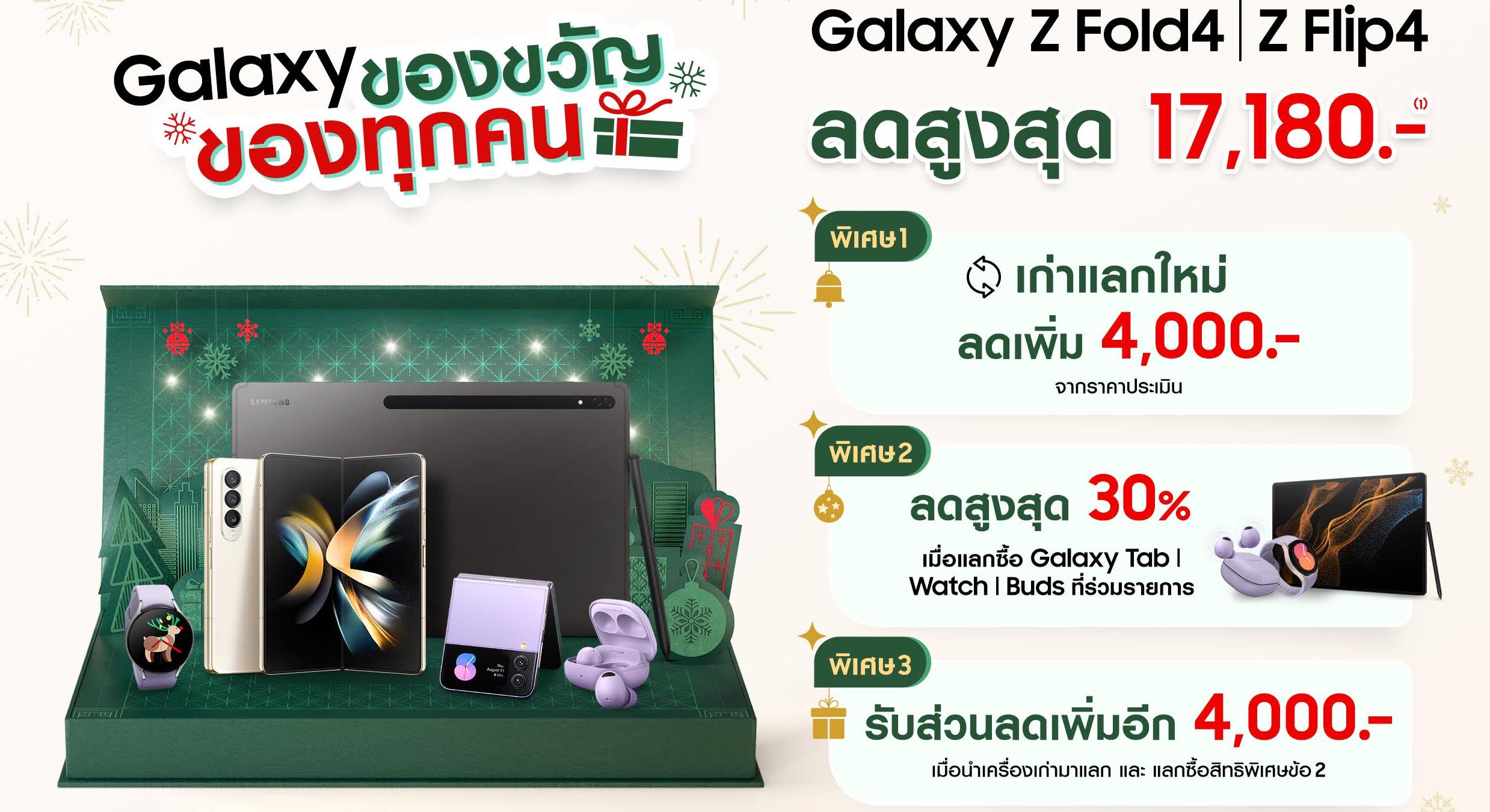 หากใครยังไม่ได้เป็นเจ้าของ Galaxy Z Fold4 และ Galaxy Z Flip4 รีบมาพับตามเทรนด์กันได้เลย รับส่วนลดสูงสุดถึง 17,180 บาท! พิเศษที่ 1 โปรเก่าแลกใหม่ได้ส่วนลดเพิ่ม 4,000 บาท พิเศษที่ 2 แลกซื้อ Galaxy Tab l Watch l Buds รุ่นที่ร่วมรายการรับส่วนลดสูงสุด 30% พิเศษที่ 3 รับส่วนลดเพิ่มอีก 4,000 บาท เมื่อนำเครื่องเก่ามาแลกและแลกซื้อเพิ่มในต่อที่ 2 พร้อมรับฟรี ประกันจอแตก ตกน้ำ จาก Samsung Care+ มูลค่าสูงสุด 7,999 บาท