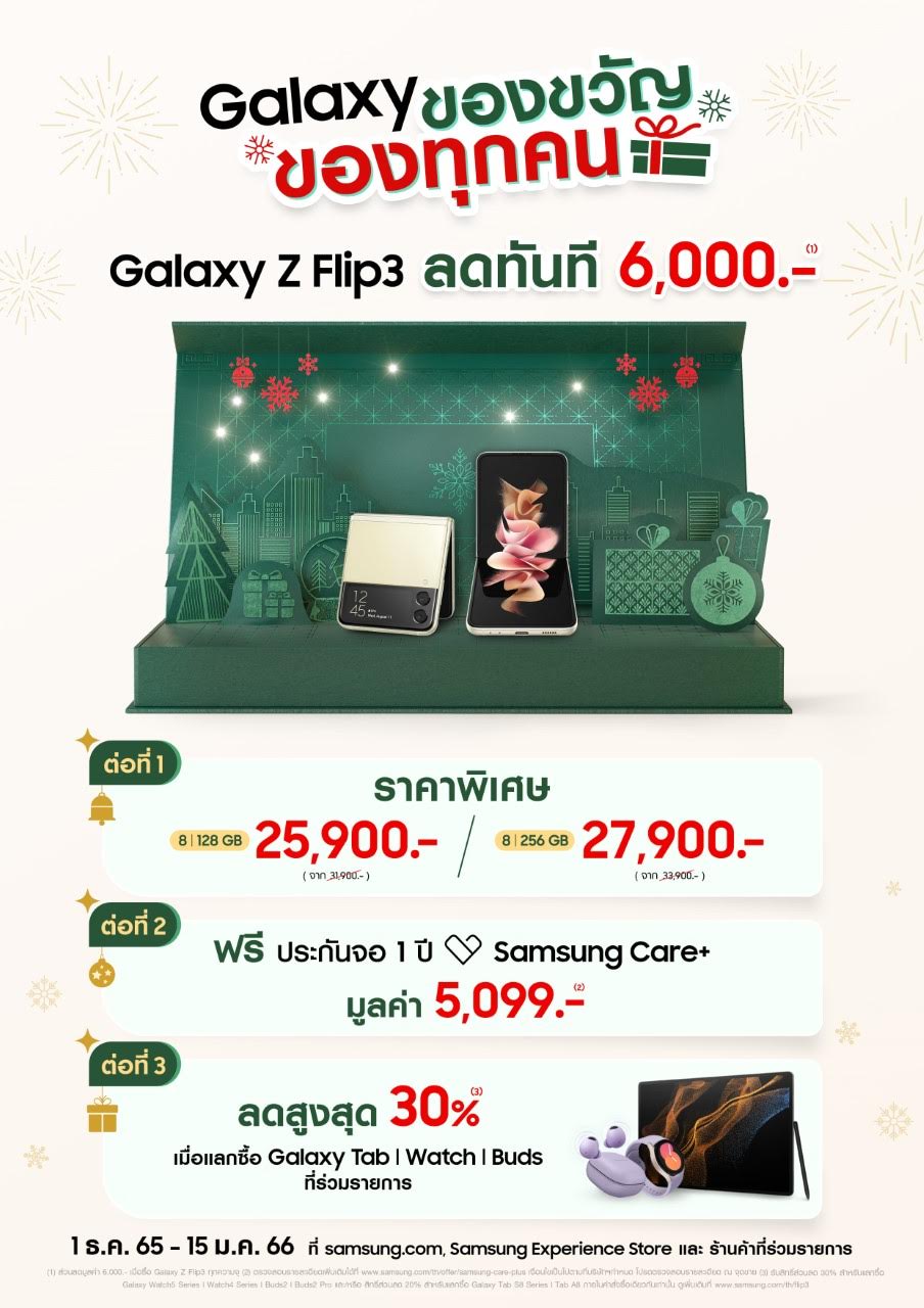 โปรโมชันเอาใจสายพับ Galaxy Z Flip3 ที่ยังไม่เลิกฮิต ซัมซุงจัดโปรส่งมอบความสุขในสิ้นปีนี้ หากใครไม่เคยได้ลองใช้สมาร์ทโฟนจอพับได้ จัดเลย ด้วยส่วนลดทันที 6,000 บาท เมื่อซื้อ Galaxy Z Flip3 พิเศษที่ 1 ราคาพิเศษเพียง 25,900 บาท (128GB) และ 27,900 บาท (256GB) พิเศษที่ 2 รับฟรีประกันหน้าจอแตก ตกน้ำ 1 ปี จาก Samsung Care + มูลค่า 5,099 บาท และ พิเศษที่ 3 แลกซื้อ Galaxy Tab l Watch l Buds รุ่นที่ร่วมรายการรับส่วนลดสูงสุด 30%
