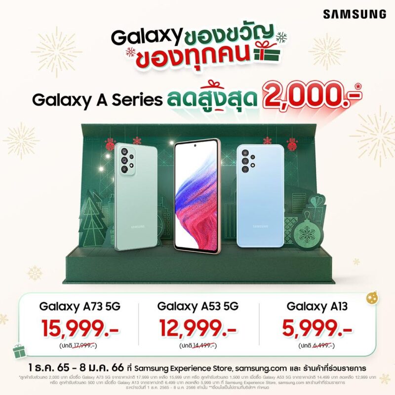 *ลูกค้ารับส่วนลด 2,000 บาท เมื่อซื้อ Galaxy A73 5G จากราคาปกติ 17,999 บาท เหลือ 15,999 บาท หรือ รับส่วนลด 1,500 บาท เมื่อซื้อ Galaxy A53 5G จากราคาปกติ 14,499 บาท ลดเหลือ 12,999 บาท หรือ ลูกค้ารับส่วนลด 500 บา เมื่อซื้อ Galaxy A13 จากราคาปกติ 6,499 บาท ลดเหลือ 5,999 บาท ที่ Experience store, Samsung.com และร้านค้าที่ร่วมรายการ ระหว่างวันที่ 1 ธ.ค. 2565 – 8 ม.ค. 2566