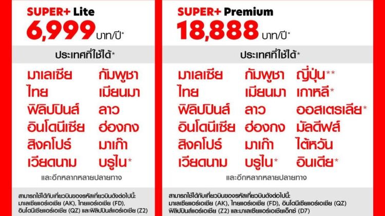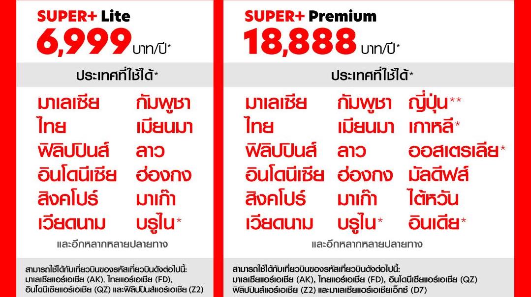 ทั้งนี้เพื่อตอบโจทย์ความต้องการของนักเดินทางที่มีความชื่นชอบเดินทางไปในจุดหมายปลายทางที่แตกต่างกัน “SUPER+ Subscription” จึงนำเสนอแพ็กเกจสมาชิกรายปี “บินสนั่นจุใจ” 2 รูปแบบ โดยแพ็กเกจเบสิก (SUPER+ Lite) ราคา 6,999 บาท เป็นแพ็กเกจการเดินทางที่ครอบคลุมทั้งเส้นทางภายในประเทศและระหว่างประเทศ อาทิ เส้นทางในอาเซียน ฮ่องกง มาเก๊า และอื่นๆ (รหัสเที่ยวบิน FD,AK,QZ และ Z2) รับ airasia points 800 คะแนน ขณะที่แพ็กเกจพรีเมียม (SUPER+ Premium) ราคา 18,888 บาท ครอบคลุมเส้นทางภายในประเทศและระหว่างประเทศ อาทิ เส้นทางในอาเซียน ฮ่องกง มาเก๊า อินเดีย ไต้หวัน มัลดีฟส์ ฟุกุโอกะ (รหัสเที่ยวบิน FD,AK,QZ และ Z2) รวมถึงเส้นทางญี่ปุ่น เกาหลีใต้ ออสเตรเลีย (รหัสเที่ยวบิน D7 ต่อเครื่องที่สนามบินกัวลาลัมเปอร์) รวมกว่า 130 เส้นทางบิน รับ airasia points 2,000 คะแนน โดยมีสิทธิ์แลกเที่ยวบินรวมตลอดทั้งปีไม่น้อยกว่า 3,000,000 ที่นั่ง (เดินทางด้วยรหัสเที่ยวบิน AK, FD, QZ, Z2 และ D7 สำหรับแพ็กเกจพรีเมียม) นอกจากนี้ผู้สมัครทั้ง 2 ประเภท ยังได้รับส่วนลด 10% ของราคาโดยสารจาก airasia ride และส่วนลด 5% เมื่อจองโรงแรมผ่านแอปพลิเคชัน airasia Super App