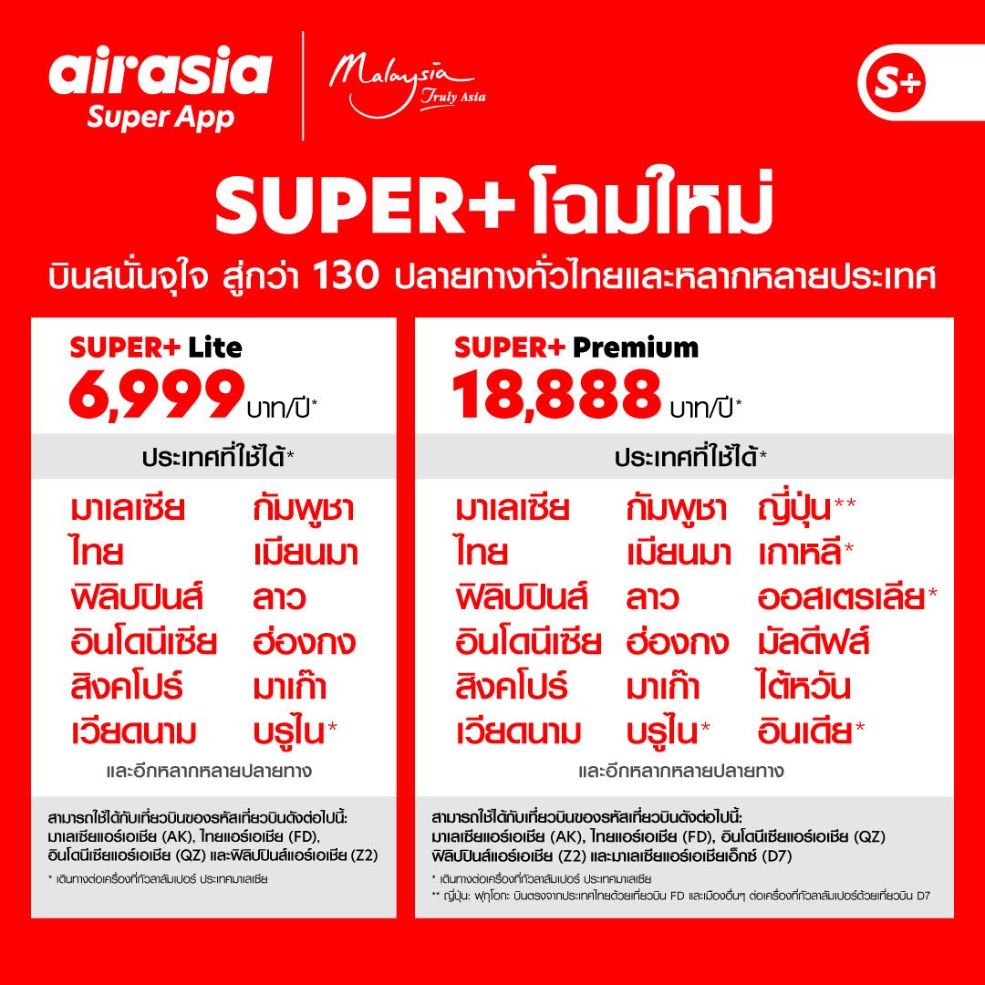 *ตรวจสอบข้อกำหนดเเละเงื่อนไข SUPER+ Subscription (ธันวาคม 2565)เพิ่มเติมก่อนการสมัครได้ที่ https://www.airasia.com/superplus/en/gb/terms-and-conditions/superplua-lp-th