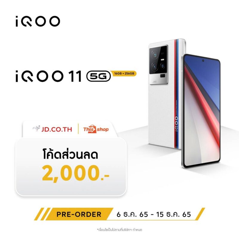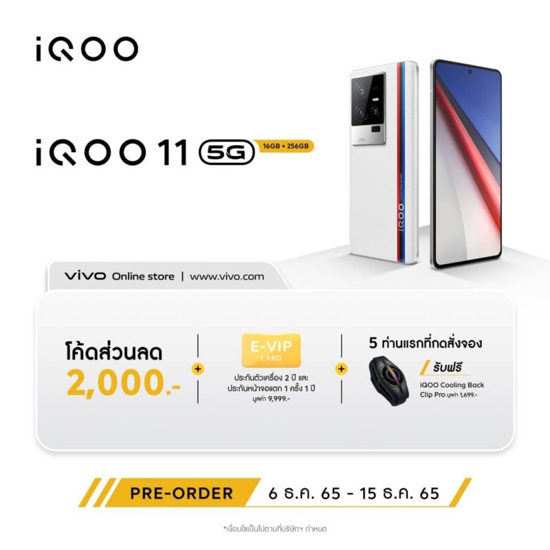ลูกค้าที่สนใจสามารถพรีออเดอร์ iQOO 11 5G ได้แล้ววันนี้ ผ่านช่องทางออนไลน์ที่ vivo Online Store, Lazada, Shopee, jd.co.th และ Thisshop สามารถติดตามรายละเอียดเพิ่มเติมได้ที่เว็บไซต์ https://www.vivo.com/th/