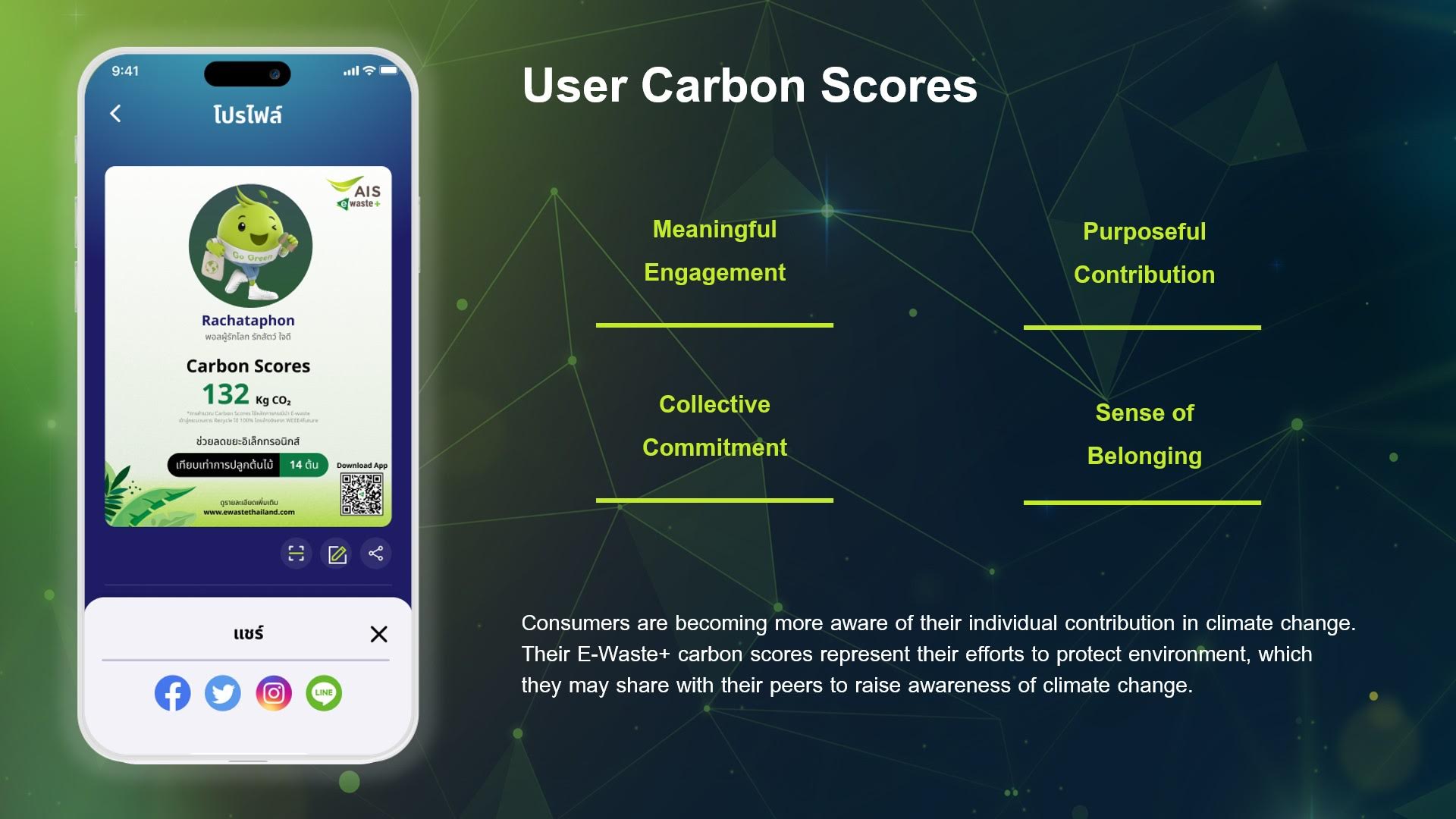 โดยเทคโนโลยี Blockchain จะช่วยทำให้ผู้ทิ้งมั่นใจว่าขยะ E-Waste จะถูกนำส่งไปยังกระบวนการรีไซเคิลที่ได้มาตรฐานและโปร่งใส ซึ่งจะสามารถตรวจสอบสถานะของกระบวนการนำส่งได้ในแต่ละขั้นตอน และนอกเหนือจากนั้นยังสามารถคำนวณปริมาณ Carbon Scores ซึ่งเป็นเครื่องบ่งบอกถึงการลงมือทำในกิจกรรมที่ช่วยลดการปล่อยก๊าซเรือนกระจก ที่สามารถแชร์ในโซเชียลและแสดงตัวตนในโลก Metaverse ได้ โดย AIS ยังมีแผนพัฒนาให้ Carbon Scores ที่เกิดจากการมีส่วนร่วมของทุกภาคส่วนในการจัดการขยะ E-Waste อย่างถูกต้อง นำไปใช้เป็น Utility Token ที่จะช่วยต่อยอดธุรกิจให้กับองค์กรพันธมิตรที่เข้าร่วมโครงการนี้อีกด้วย”