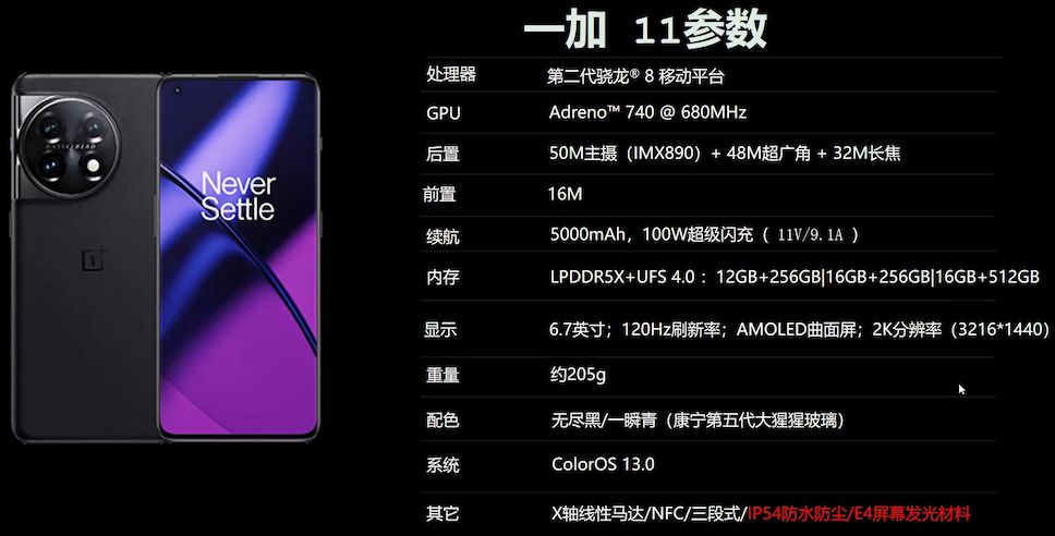 OnePlus 11 จะใช้ชิปประมวลผล Qualcomm Snapdragon 8 Gen 2 ความจำ RAM 12GB/16GB (LPDDR5X) จับคู่กับ ROM 256GB/512GB (UFS 4.0) ความจุแบตเตอรี่ 5,000mAh รองรับชาร์จเร็ว 100W โดยมีน้ำหนักตัวเครื่อง 205 กรัม