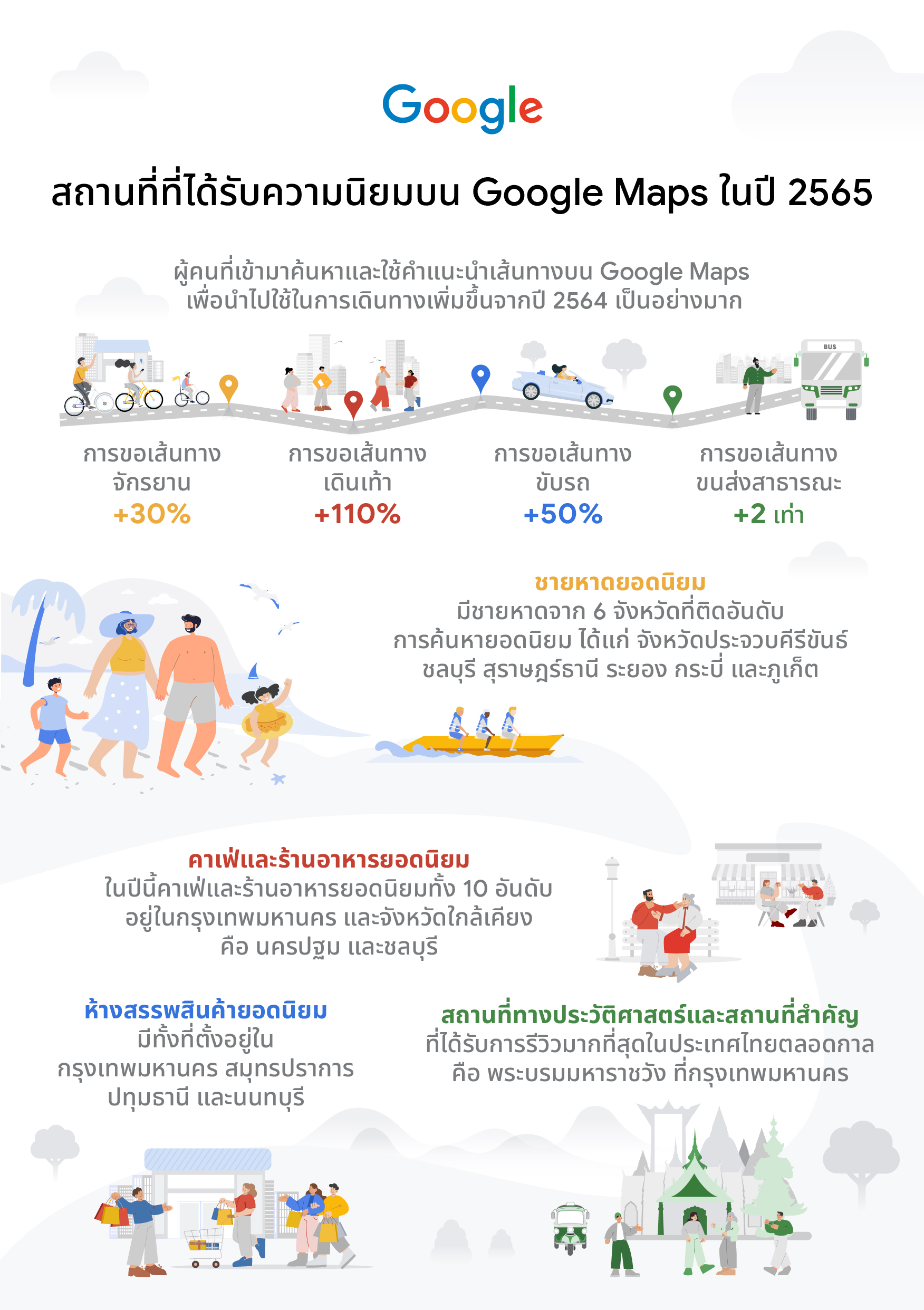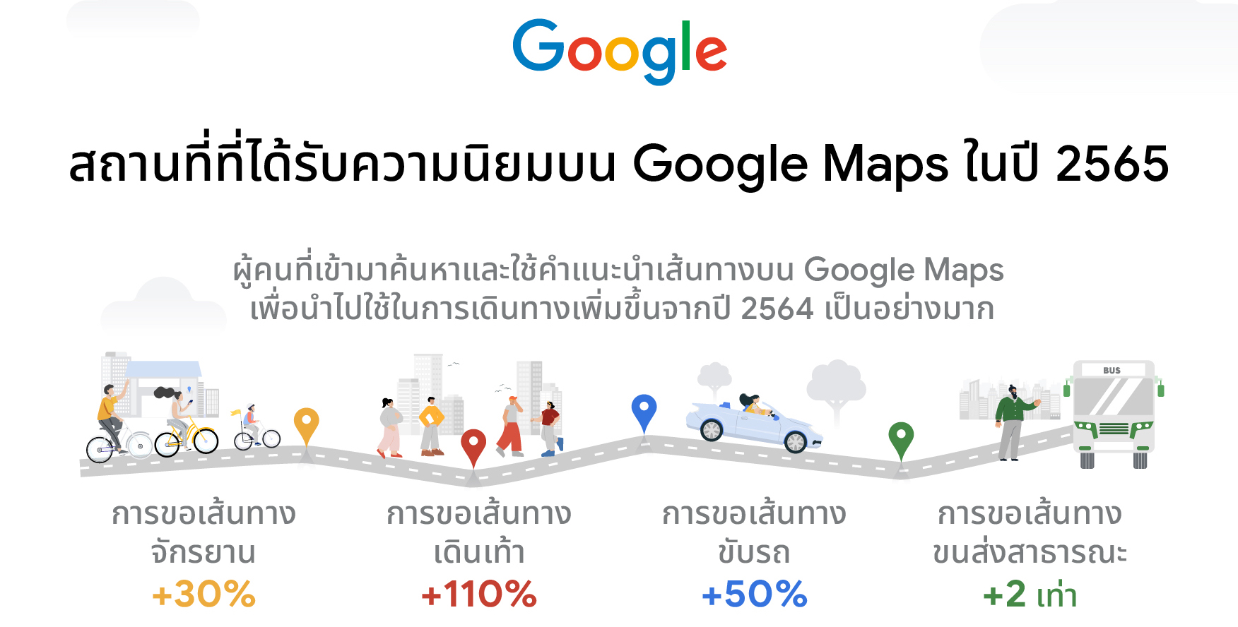 ในช่วงปี 2565 ที่ผ่านมา เมื่อสถานการณ์โควิด-19 ได้เริ่มคลี่คลายลง คนไทยก็เริ่มมั่นใจในการออกเดินทางท่องเที่ยวกันมากขึ้น ซึ่งสามารถเห็นได้จากจำนวนผู้คนที่เข้ามาค้นหาและใช้คำแนะนำเส้นทางบน Google Maps เพื่อนำไปใช้ในการเดินทางเพิ่มขึ้นจากปี 2564 เป็นอย่างมาก ได้แก่ การขอเส้นทางจักรยานเพิ่มขึ้น 30% การขอเส้นทางเดินเท้าเพิ่มขึ้น 110% การขอเส้นทางขับรถเพิ่มขึ้นกว่า 50% และการขอเส้นทางเส้นทางขนส่งสาธารณะเพิ่มขึ้นกว่า 2 เท่า