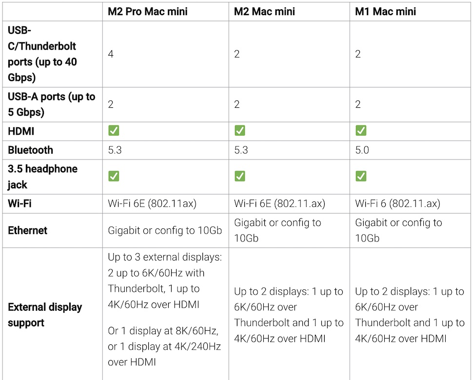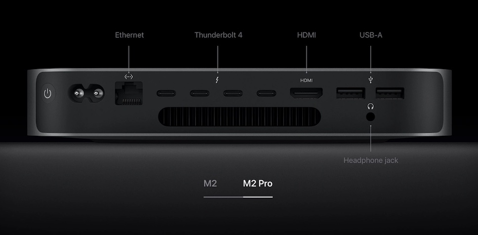 ด้านการเชื่อมต่อไร้สาย Mac mini รุ่นชิป M2 และ M2 Pro รองรับเทคโนโลยี WiFi 6E และ Bluetooth 5.3 แต่เมื่อพูดถึงพอร์ตเชื่อมต่อต่างๆ รุ่น M2 Pro ได้รับการปรับปรุงเพิ่มเติมด้วยพอร์ต Thunderbolt 4/USB 4 (4 ช่อง) รองรับการต่อจอแสดงผลภายนอกสูงสุด 3 จอ และเอาต์พุตสูงสุด 8K ผ่าน HDMI (คาดว่าว่าใช้มาตรฐาน HDMI 2.1 แต่ Apple ไม่ได้ระบุ)
