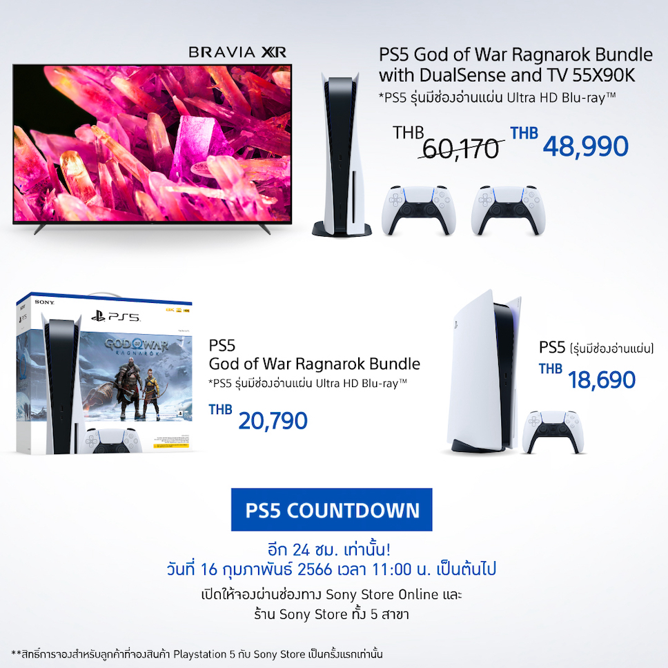 - PlayStation5 รุ่น God of War Ragnarok Bundle with DualSense and TV 55X90K ราคาพิเศษ 48,990 บาท (ราคาปกติ 60,170 บาท)