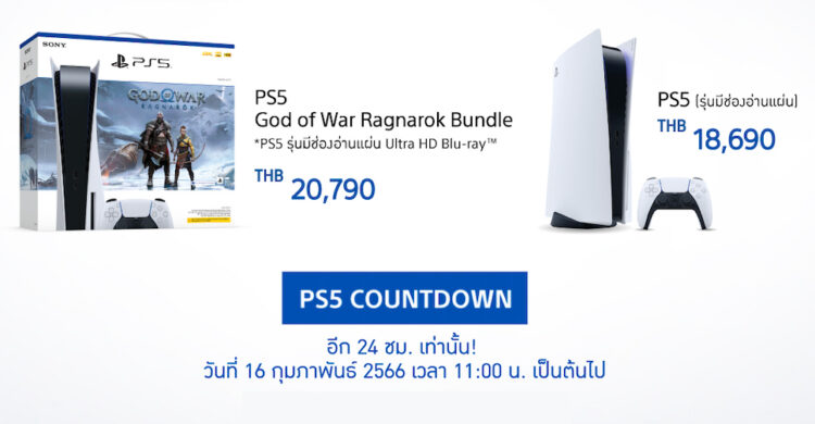 Sony Thai ประกาศรับจองคอนโซล PlayStation 5 รอบใหม่ ในวันที่ 16 กุมภาพันธ์ 2566 ตั้งแต่ เวลา 11.00 น. เป็นต้นไป ผ่านทาง Sony Store Online และ ร้าน Sony Store ทั้ง 6 สาขา