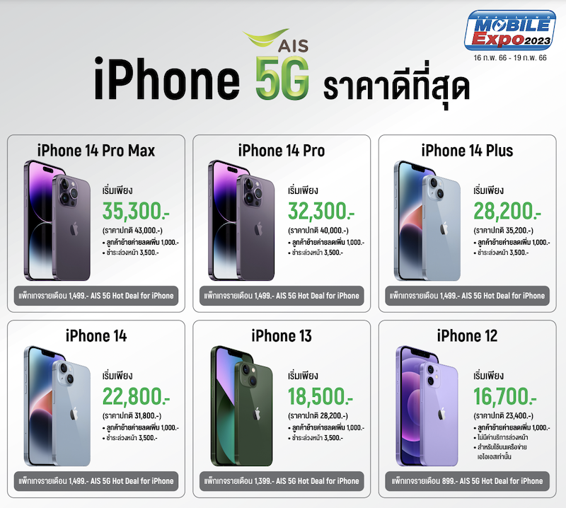 ส่วนทางด้านของ iPhone ก็ได้มีการจัดโปรโมชันโดน ๆ มาให้ด้วยเช่นกัน ไม่ว่าจะเป็น iPhone 14 Series ในราคาดีสุดคุ้ม เริ่มต้นเพียง 22,800 บาท อีกทั้งสามารถรับเครื่องได้ทันทีที่บูธ AIS กันไปเลย เรียกได้ว่าได้ราคาดี แถมได้เครื่องกลับไปใช้ได้ทันทีอีกด้วย