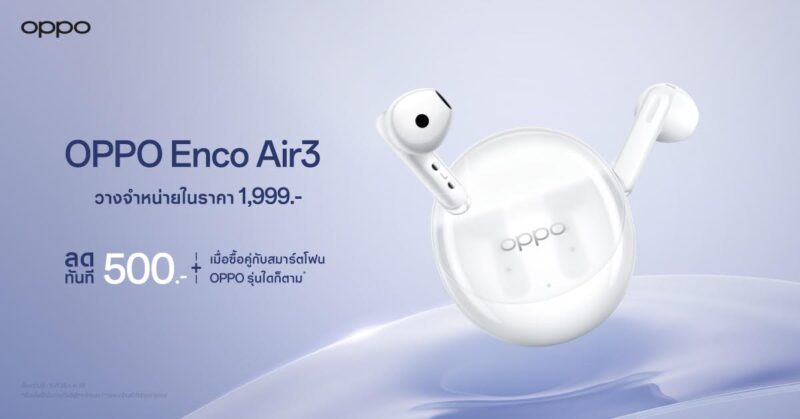 พิเศษเมื่อซื้อหูฟังไร้สาย OPPO Enco Air3 คู่กับสมาร์ตโฟน OPPO รุ่นใดก็ตาม รับส่วนลด 500 บาทในการซื้อ OPPO Enco Air3 จากราคาปกติ 1,999 บาท เหลือ 1,499 บาท ตั้งแต่วันนี้ – 28 กุมภาพันธ์ 2566