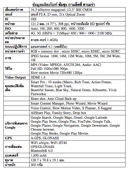 ซัมซุงพลิกโฉมวงการถ่ายภาพด้วย “ซัมซุง กาแล็คซี่ คาเมร่า (Samsung Galaxy Camera)กล้องดิจิตอลสายพันธุ์ใหม่ที่มากับระบบปฏิบัติการแอนดรอยด์ 4.1 เจลลี่บีน (Android™ 4.1 Jelly Bean) เวอร์ชันล่าสุด พร้อมเชื่อมต่อ 3G และ WiFi อัพโหลดภาพคุณภาพพร้อมแชร์ได้ทุกที่ทุกเวลา ด้วยความสามารถอย่างเหนือชั้น ในการถ่ายภาพด้วยความละเอียด 16 ล้านพิกเซล เลนส์ออพติคอลซูม 21 เท่า ซึ่งถือได้ว่ามีพลังซูมมากที่สุด ในตลาดกล้องคอมแพค